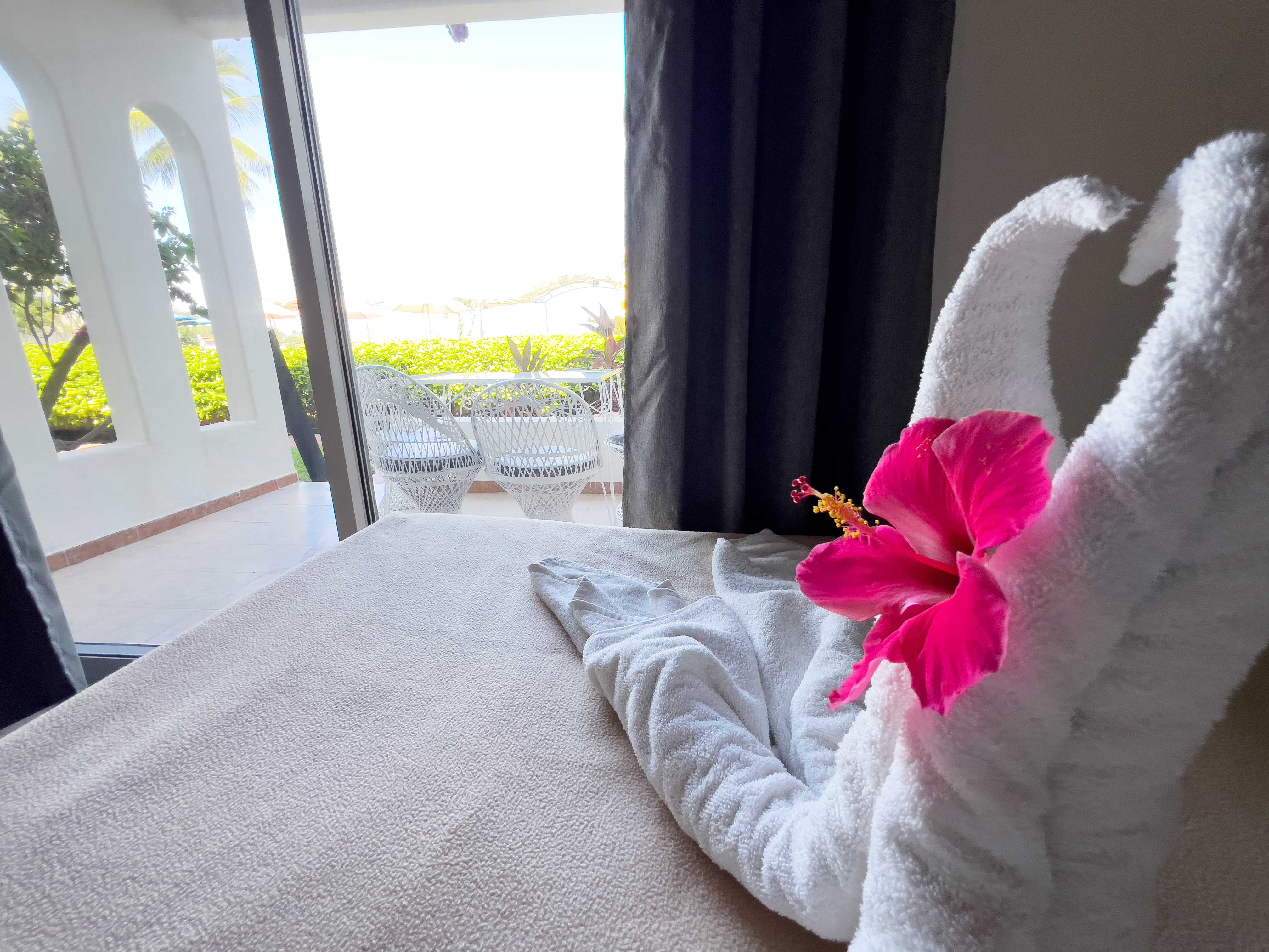Desde el cuarto, podrás tener acceso a tu propia terraza privada, donde sus grandes ventanas permiten la entrada de abundante luz natural y ofrecen vistas directas a la playa, donde podrás ver el exuberante jardín con acceso a la piscina familiar. La terraza es un lugar ideal para relajarse y disfrutar de la brisa marina.