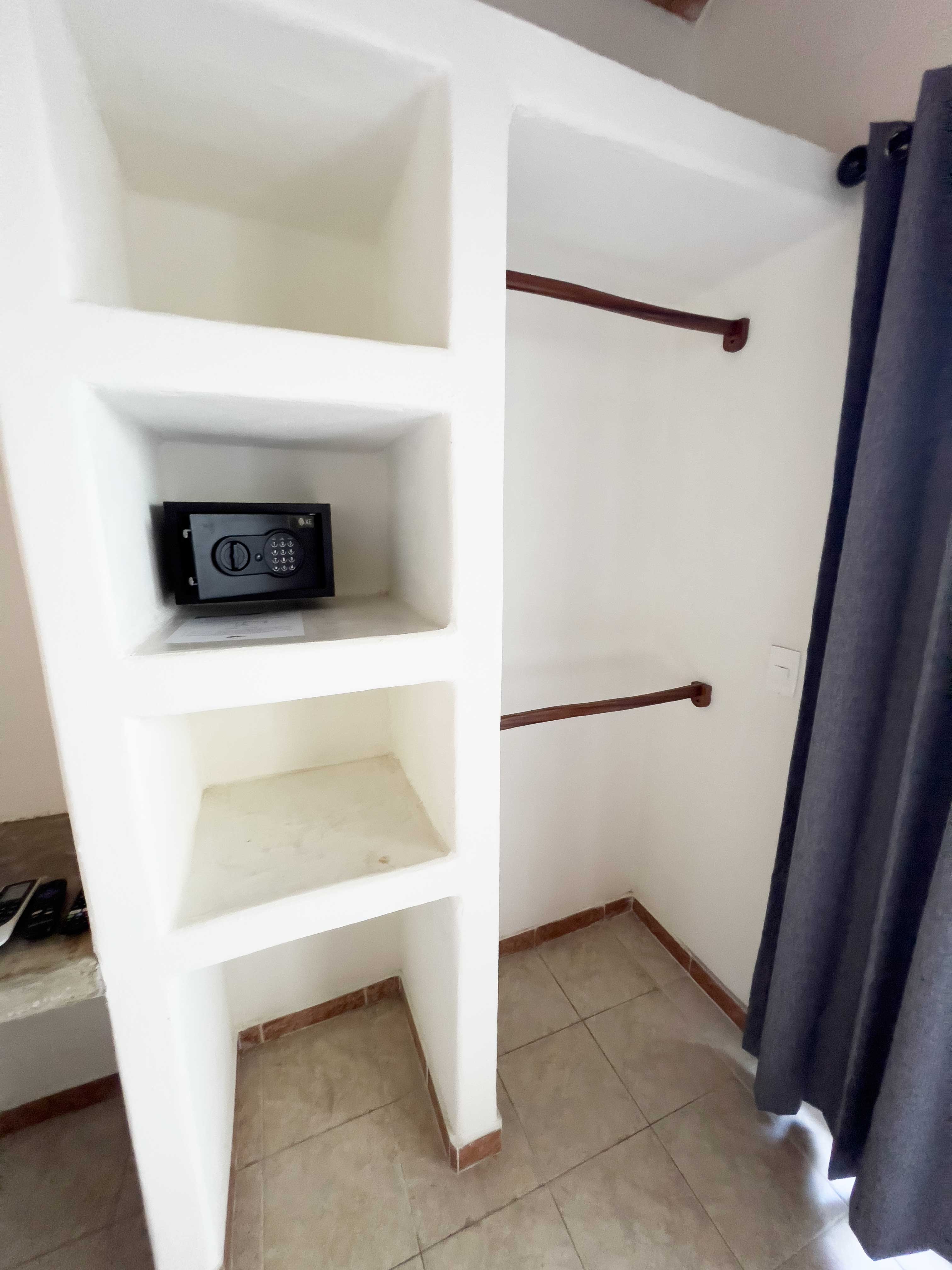 Para tu comodidad, el cuarto cuenta con Wi-Fi gratuito, una televisión de pantalla plana con canales por cable, ventilador de techo y aire acondicionado. El baño privado, decorado con materiales naturales como chukum y detalles de concreto, madera y ceramica, ofrece un espacio funcional y elegante.