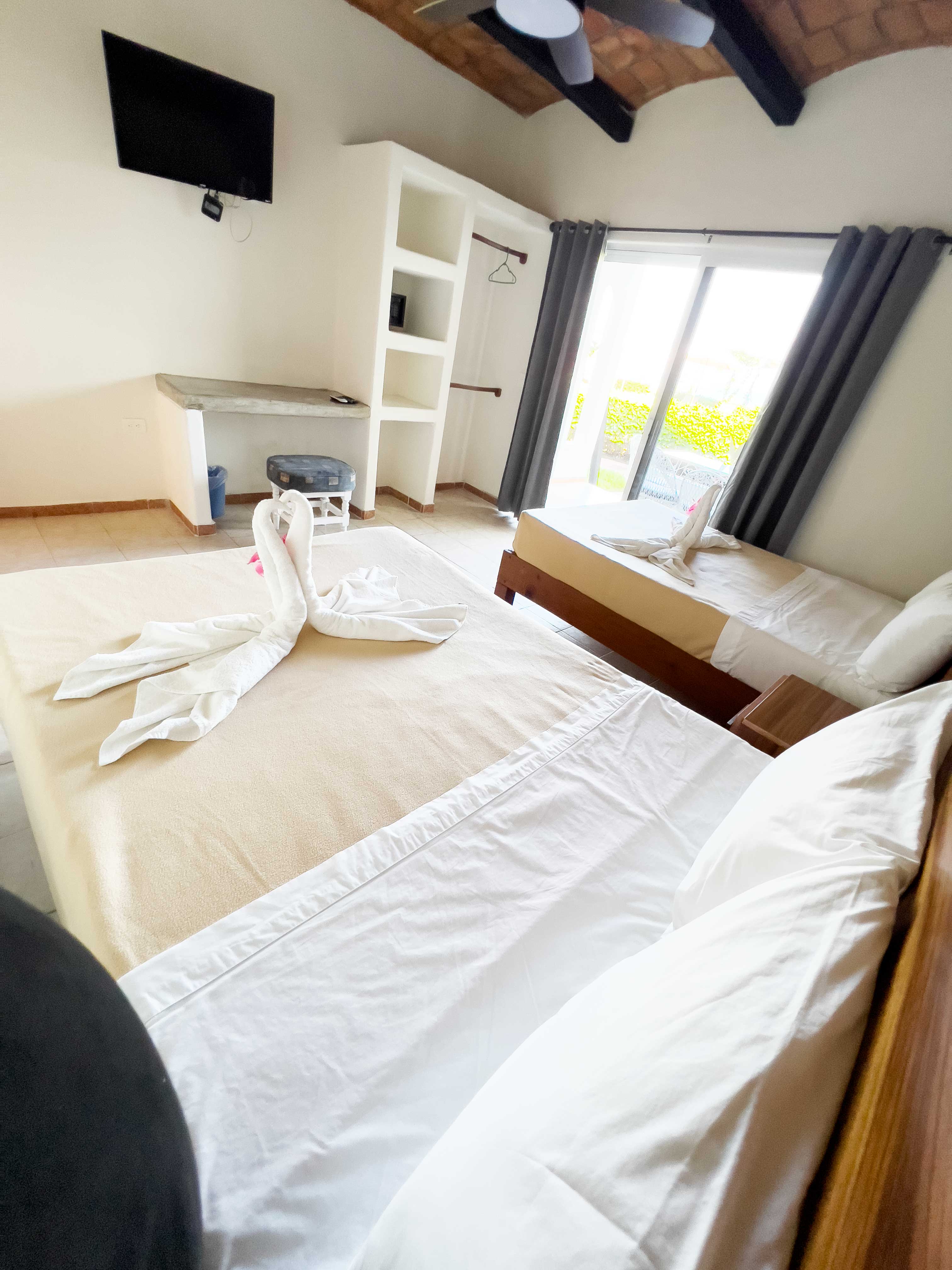 El cuarto está amueblado con materiales naturales y minimalistas, y las camas están decoradas con sábanas suaves y cálidas. frente a la cama, encontrarás una tocador y closet hechos de concreto al estilo rústico que combinado con la terracota de la bóveda catalana y la madera de parota de las camas, evocan un estilo de comfort simple y tranquilo.