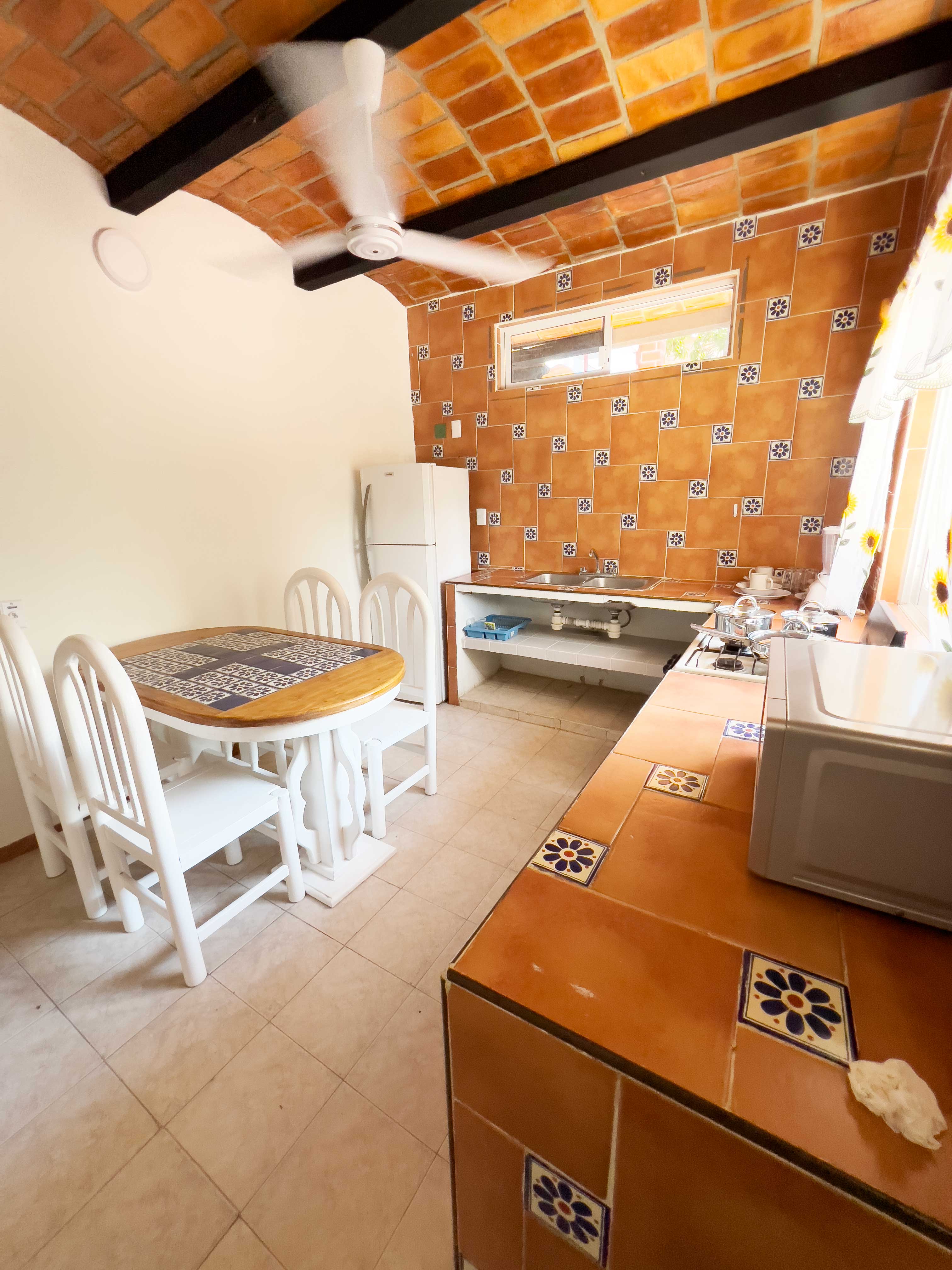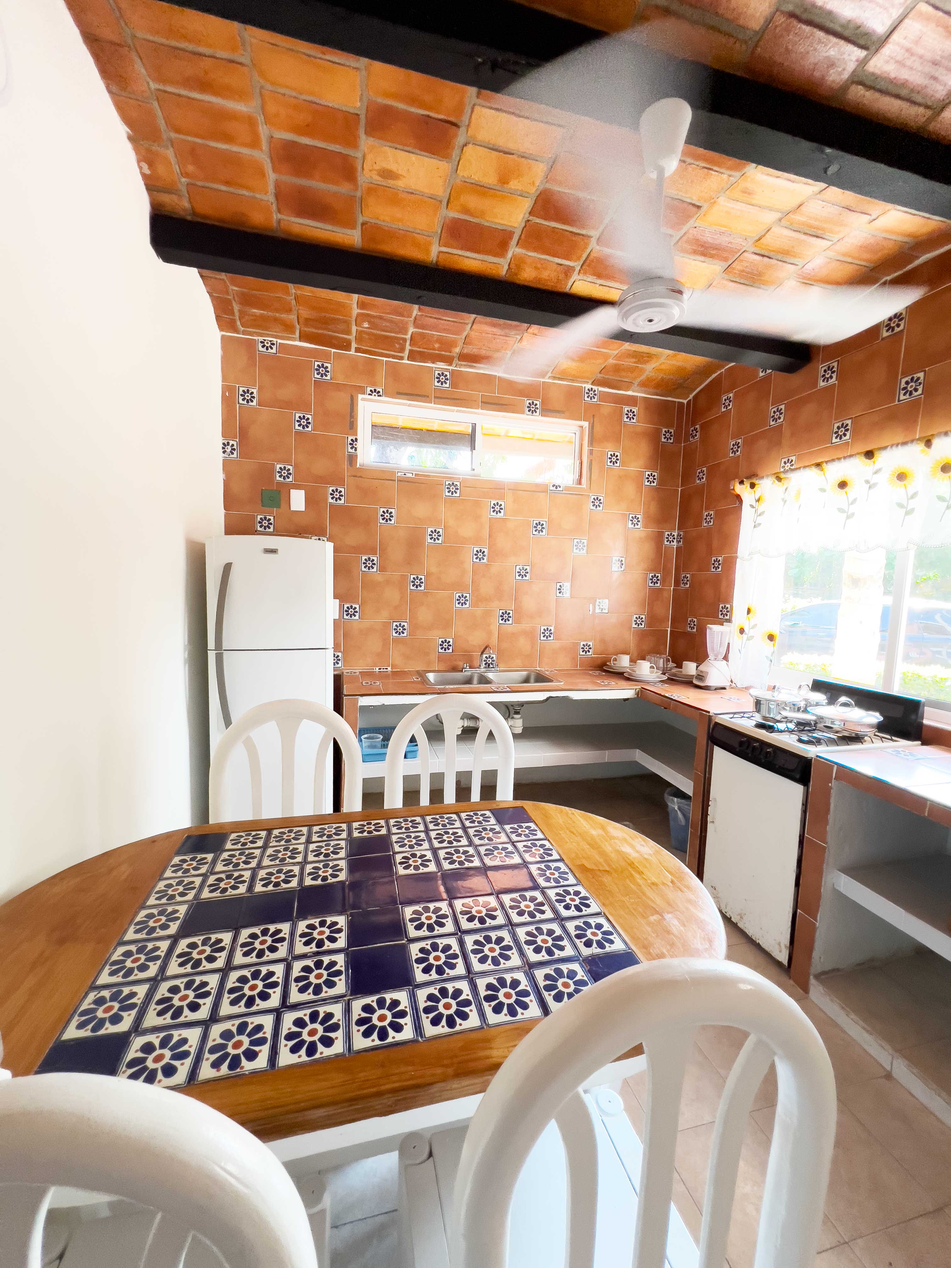 La cocina con el mismo estilo rústico, cuenta con una decoración cálida y acogedora. Las paredes están adornadas con azulejo en tonos cálidos mientras que los muebles hechos de parota añaden un toque artesanal que completan el ambiente con un toque tradicional y hogareño.